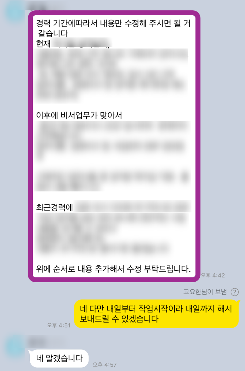 - >> 의뢰서 작성 및 자료 공유: 지원자분의 이력서, 직무기술서, 자기소개서 초안 등 필수 자료를 전달받습니다.