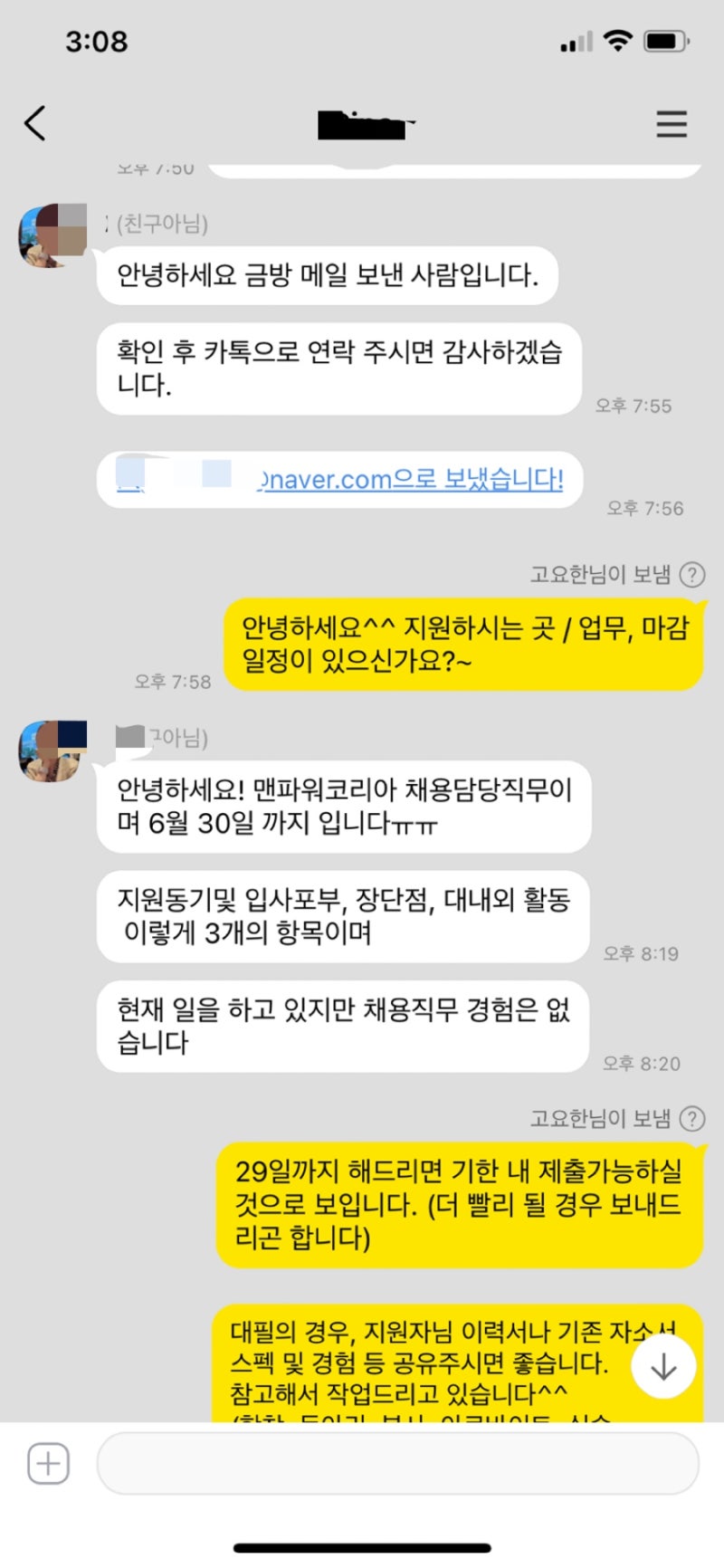 - >> 이력서 및 자기소개서(초안/지원서) 공유: 현재까지 작성된 내용을 바탕으로 컨설팅 방향을 설정합니다.