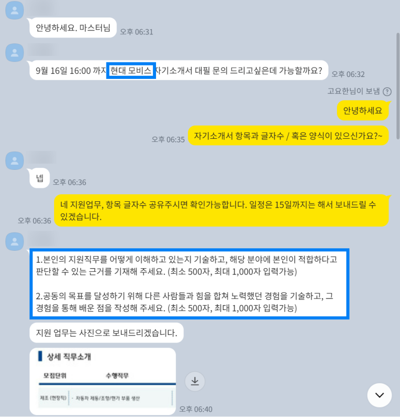 안녕하세요! 👋 취업을 향한 여러분의 뜨거운 열정을 누구보다 잘 아는 베테랑 자기소개서 전문가입니다. 매년 2000명 이상의 자소서 컨설팅을 진행하며 수백 건의 합격 사례를 만들어왔어요. 대기업부터 공기업, 중견기업, 그리고 공무직까지! 정말 다양한 분야에서 여러분의 꿈을 현실로 만들어 드렸죠. 저의 전문 분야는 취업 자기소개서 첨삭 및 대행은 물론, 학업계획서, 경력기술서 및 직무수행계획서, 그리고 최종 관문인 면접컨설팅까지! 채용공고의 숨은 의도부터 자소서 항목 및 문항 분석, 그리고 합격하는 자기소개서 작성법까지 아낌없이 공유드리고 있답니다. 이번에도 정말 기쁜 합격 소식을 들고 왔어용! 완전 긴급 건으로 들어온 현대모비스 자기소개서 첨삭 후기입니다! 🚀
